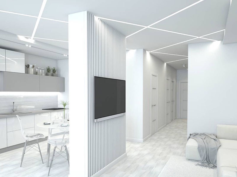 Идеальный выбор для квартир-студий и кухонь-гостиных. Линии света визуально разделяют пространство на функциональные зоны, подчеркивая геометрию комнаты.