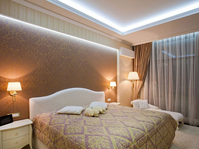 - позволяет реализовать идею скрытой подсветки – источник света, то есть светодиодная лента, прокладывается так, что не заметна человеку, но при этом дает достаточно много света и создает светящуюся ауру в комнате;