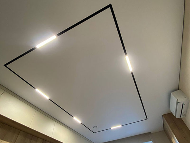 Встроенные в полотно светящиеся полосы для эффектного зонирования пространства. Создают четкую геометрию и полностью заменяют громоздкие люстры.