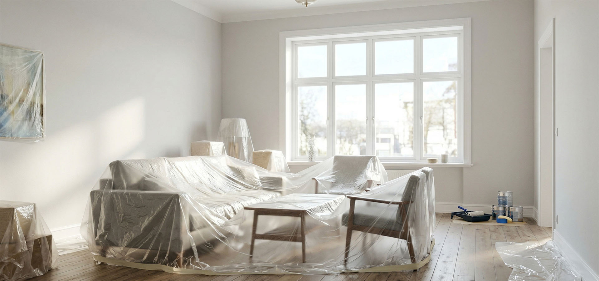 - Сдвиньте мебель в центр и укройте ее пленкой.